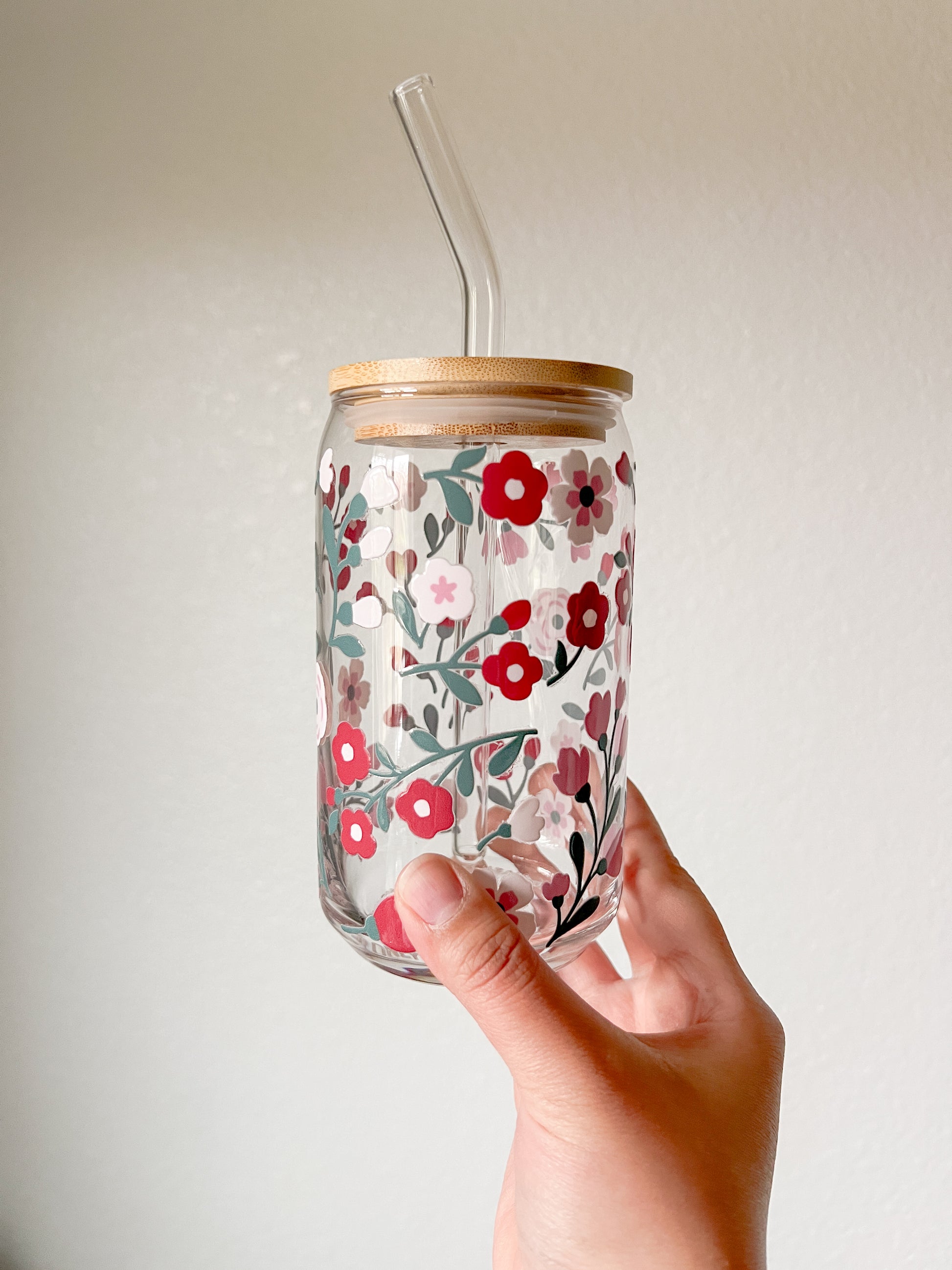 16 oz. glass cup is wrapped around with UV DTF decal. Great for drinking your iced or warm beverages. Bamboo lid and glass straw are included.