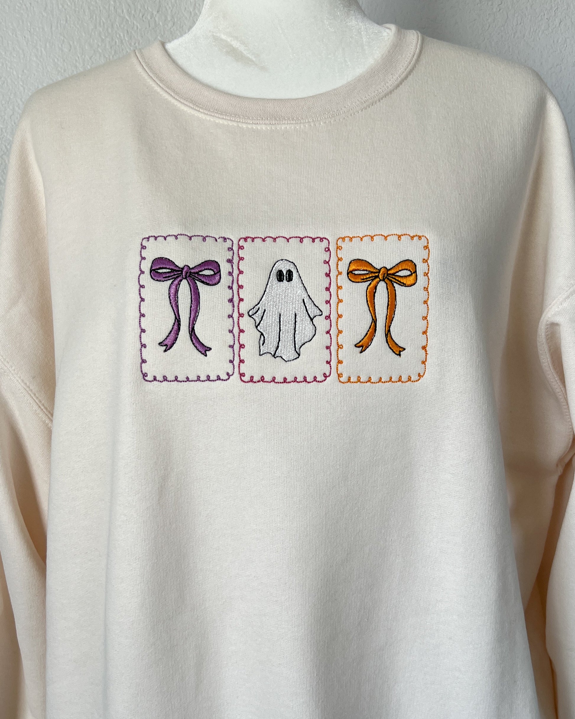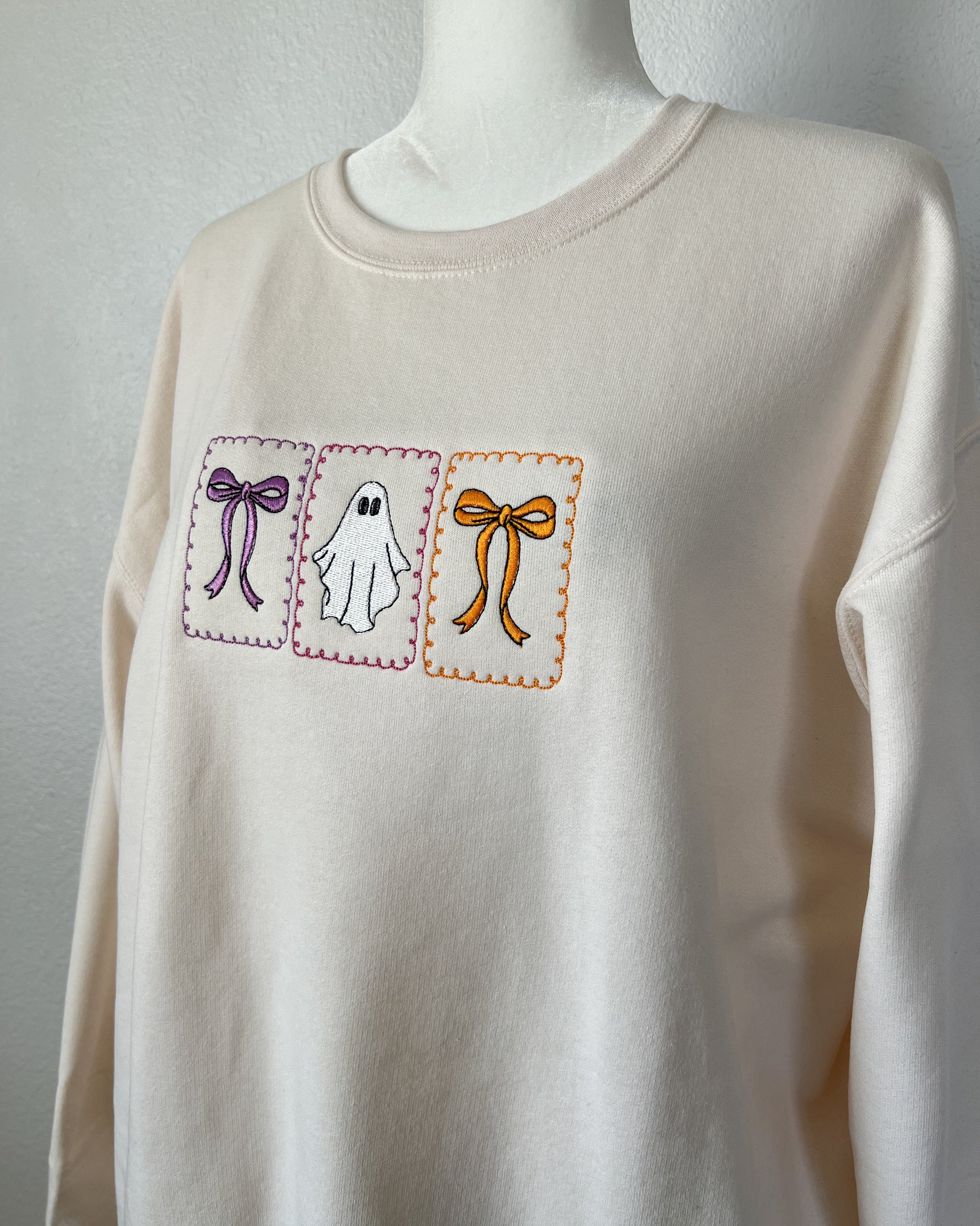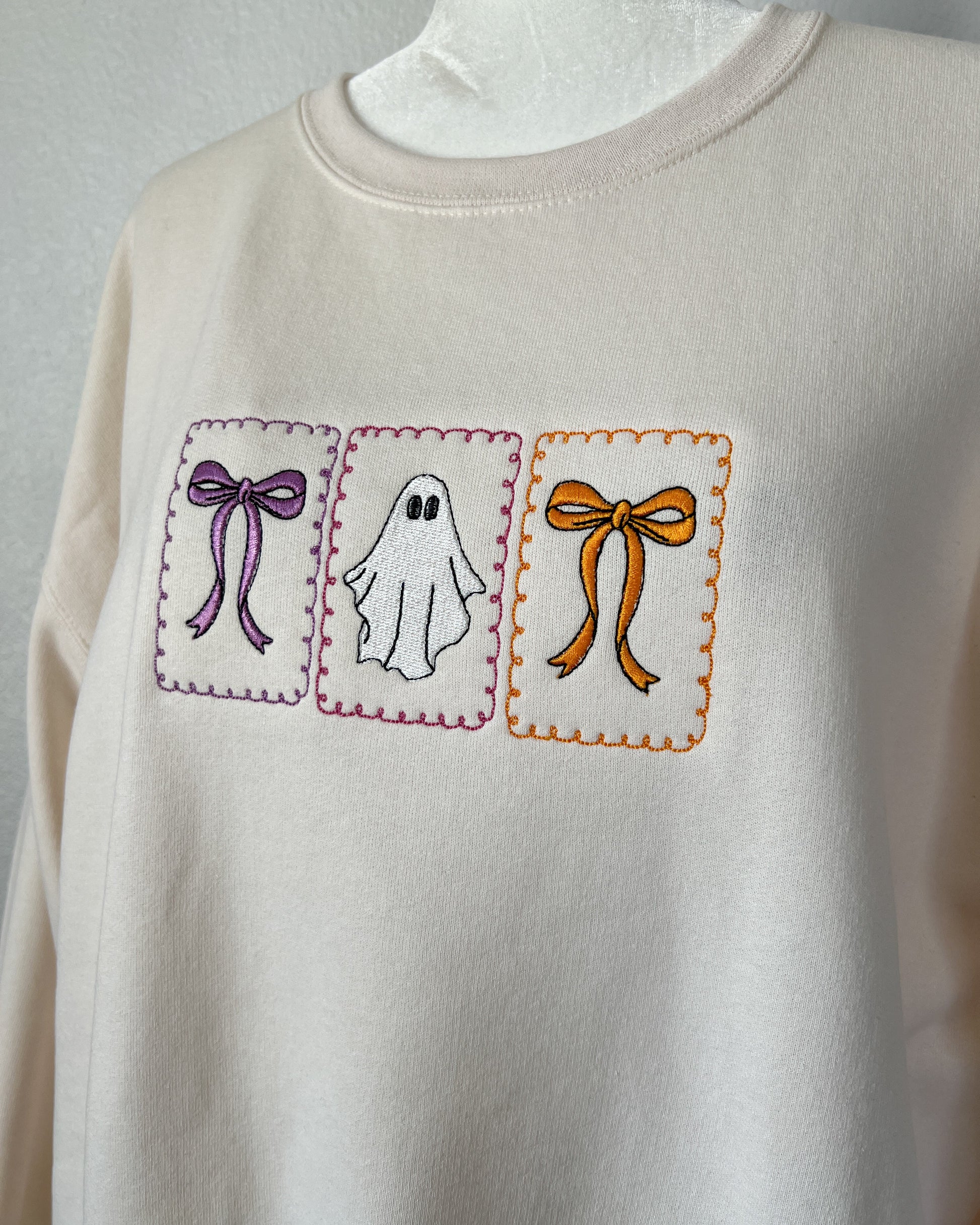 Design is embroidered onto a soft and cozy fleece Sweet Cream Heathered color sweatshirt. that is 50% cotton and 50% polyester.
