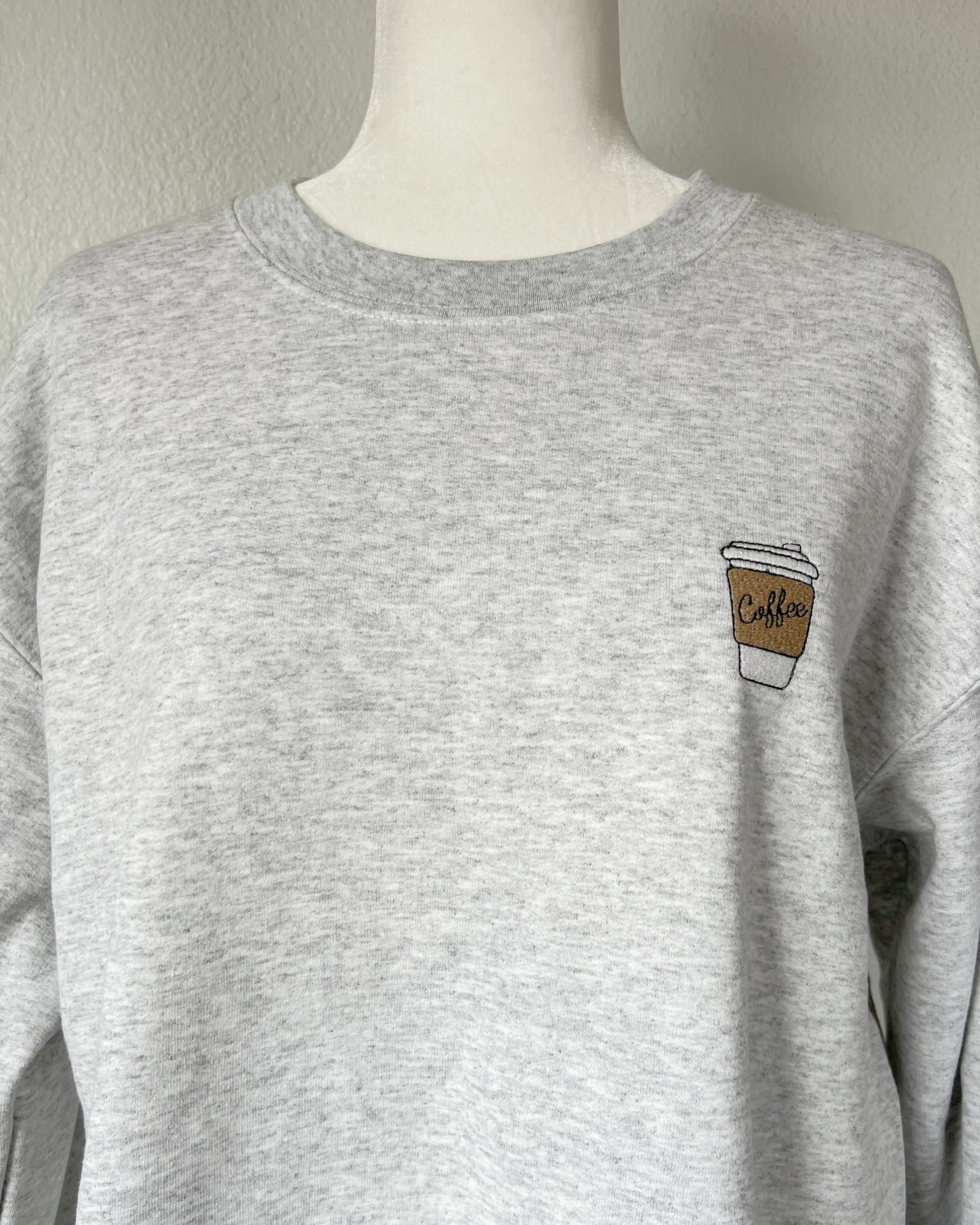 Design is embroidered onto a soft and cozy fleece crewneck that is 50% cotton and 50% polyester.