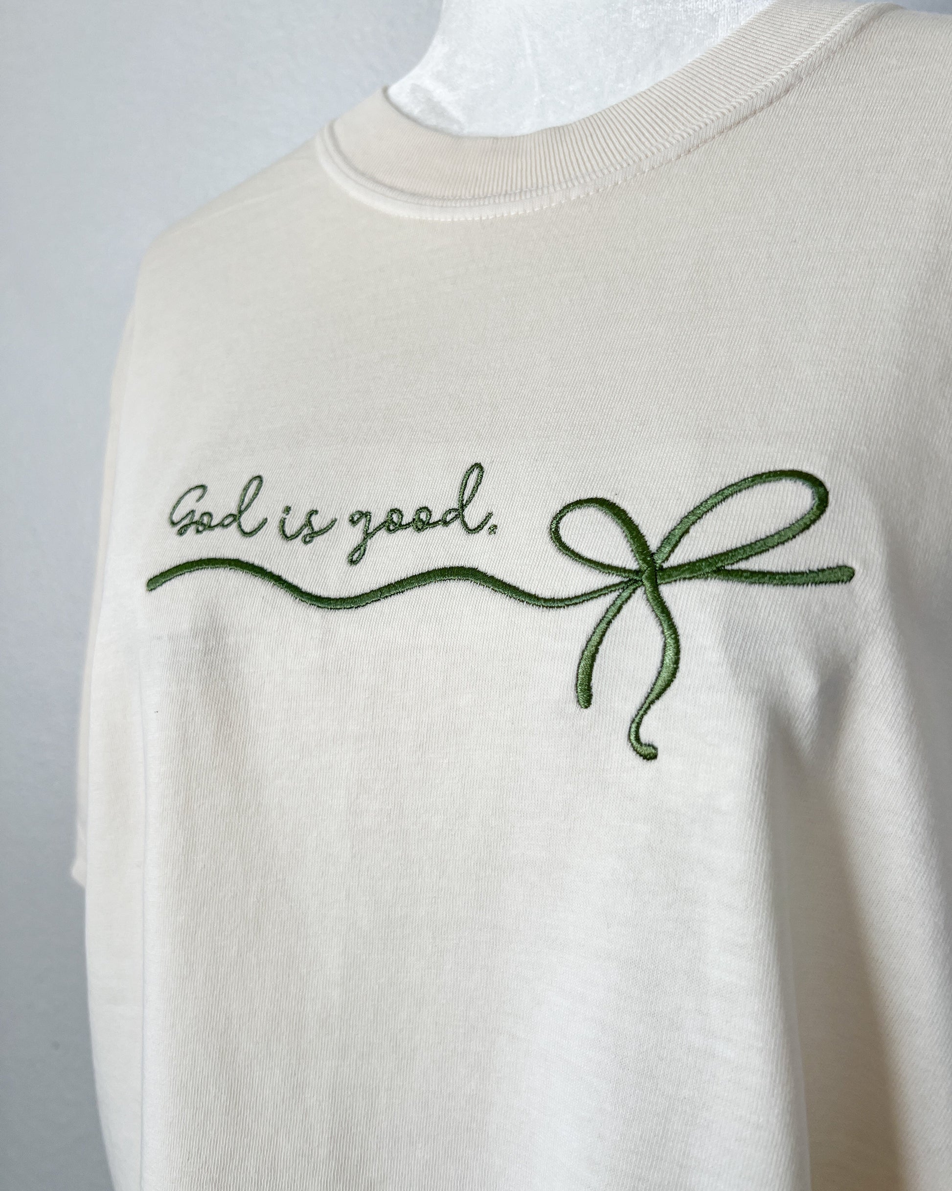 Design is embroidered onto a soft and cozy Ivory colored 100% ring-spun USA cotton t-shirt.