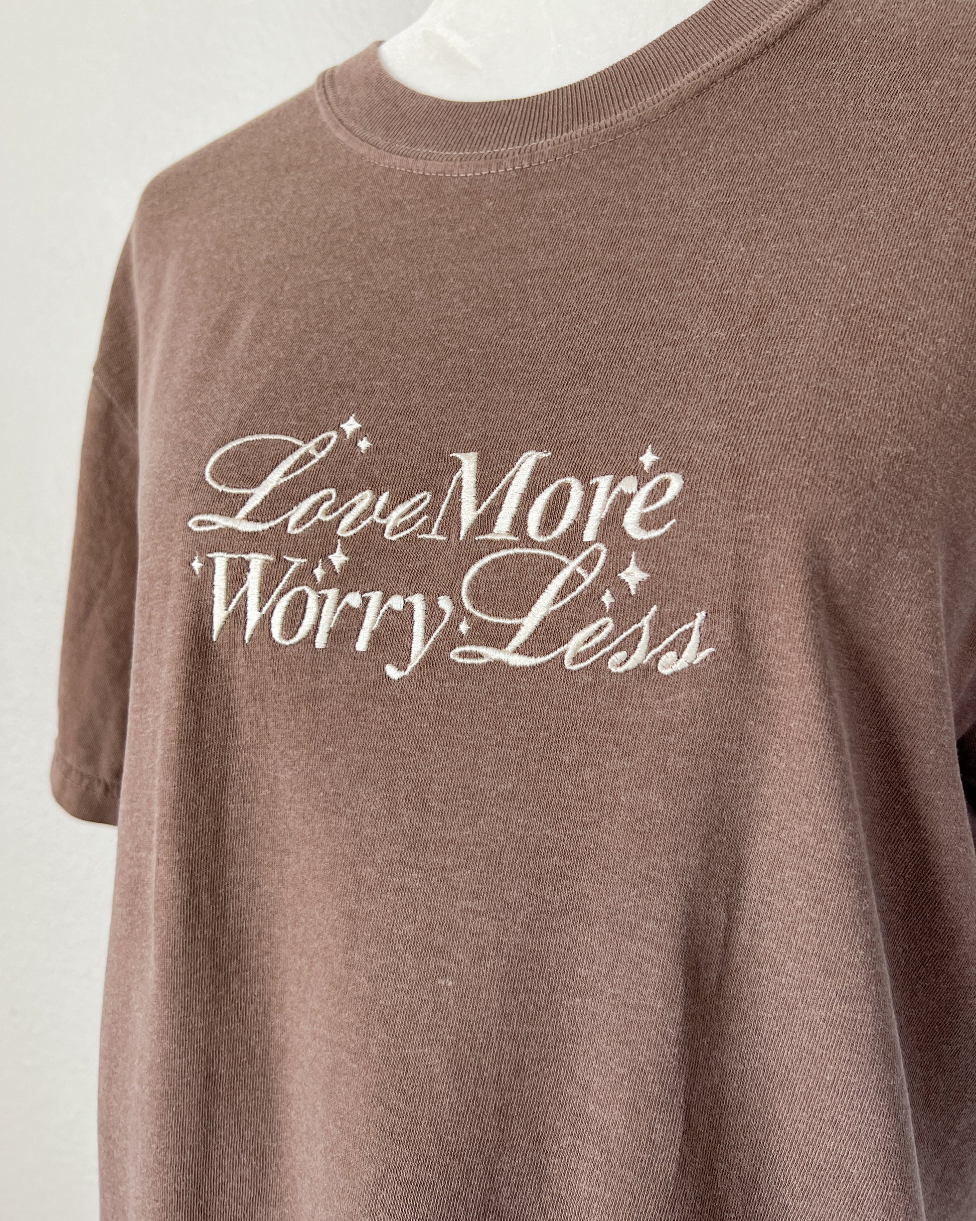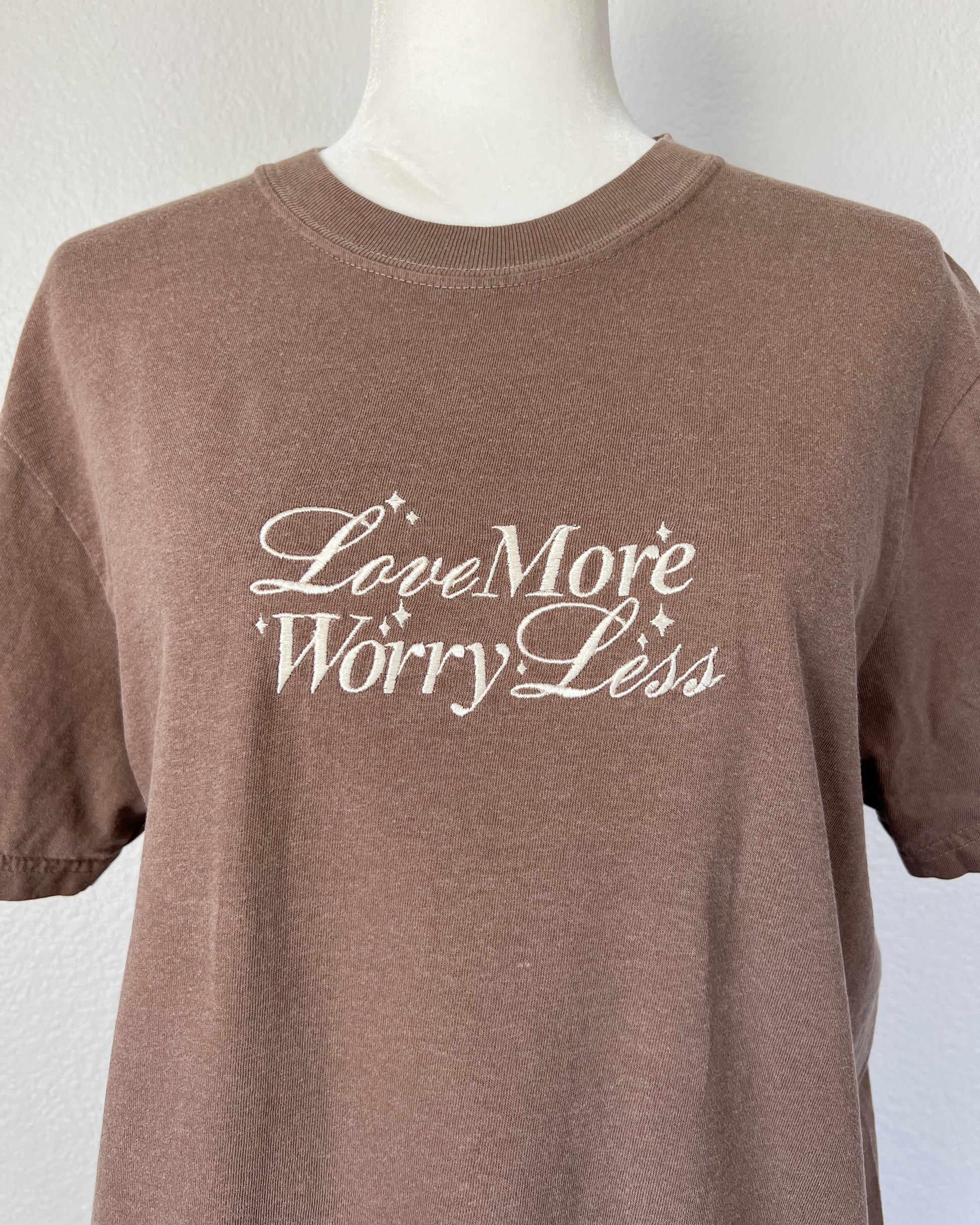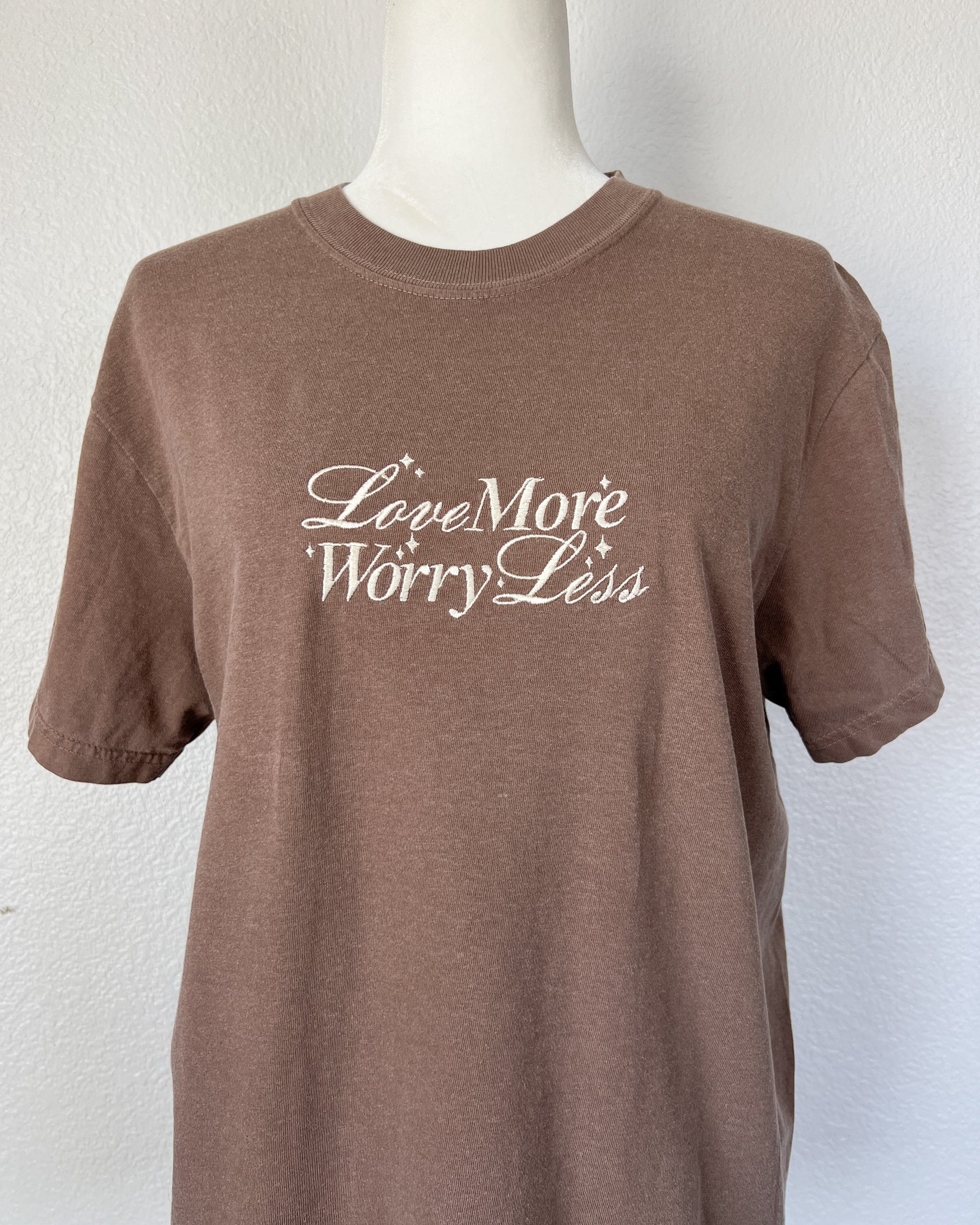Design is embroidered onto a soft and cozy Espresso colored 100% ring-spun USA cotton t-shirt.